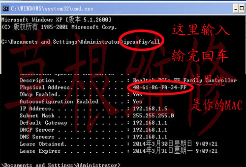 里就是你電腦的MAC地址 這個命令XP和WIN7通用,找到MAC就可以再無線路由器里設(shè)置過濾了。