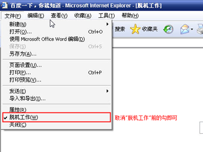 解決方法:單擊IE瀏覽器的“文件”菜單,取消“脫機(jī)工作”即可,如下圖所示: