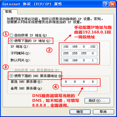 2、手動配置本地連接跟路由器同一網(wǎng)段的IP地址: