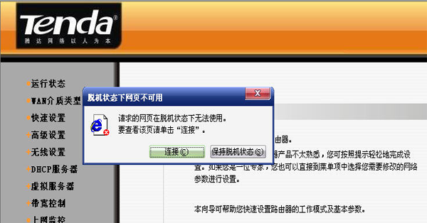 4) 現(xiàn)象3:登陸路由器管理界面顯示“脫機(jī)工作”錯(cuò)誤。
