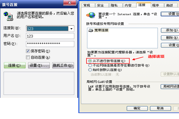 打開“瀏覽器”—“工具”菜單 “internet選項(xiàng)”選擇“連接”選項(xiàng)卡,將“始終撥打默認(rèn)連接”改為“從不進(jìn)行撥號連接”即可解決.