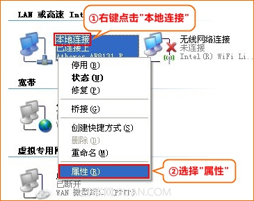 第二步:右鍵點擊“本地連接 ”,選擇“屬性 ”