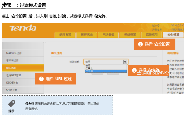 在登錄到路由器管理界面后,在安全設(shè)置 的 URL過濾 界面中來實現(xiàn)限制一的條件: