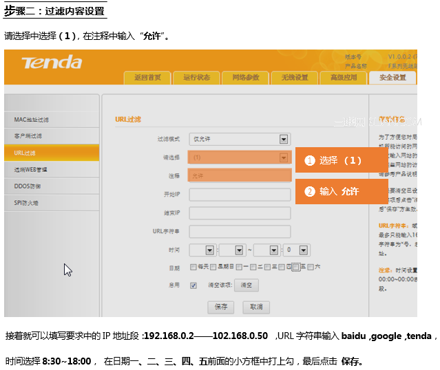 IP地址為192.168.0.2 — 192.168.0.50,在 周一至周五 8:30 –— 18:00,只允許訪問baidu,google,tenda。