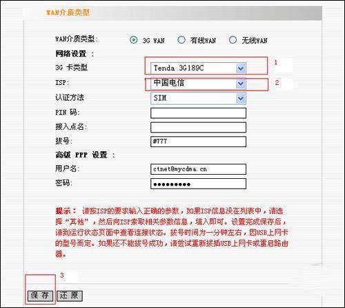 進(jìn)入WEB管理頁面后只要進(jìn)行三步操作,一選ISP,二選3G上網(wǎng)卡型號、三點(diǎn)保存,即可完成設(shè)置,非常簡單,基本在3分鐘內(nèi)完成安裝設(shè)置。(如圖所示)