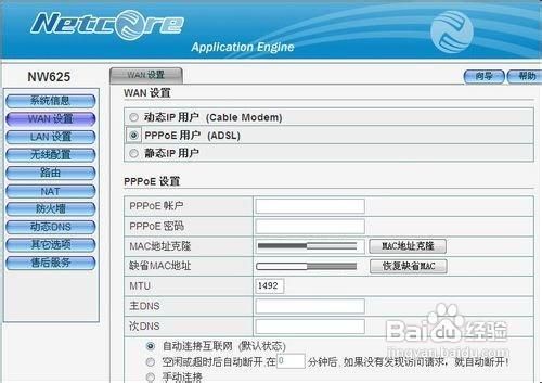 13.最后,我們來配置上網(wǎng)的設置(此處以PPPoE撥號網(wǎng)絡為例)。點擊左側的“WAN設置”,再點擊右邊的“PPPoE用戶”單選項,再在下面的填寫正確的PPPoE帳戶和密碼: