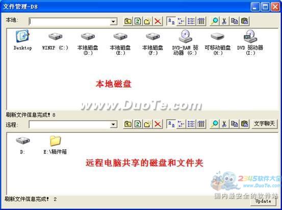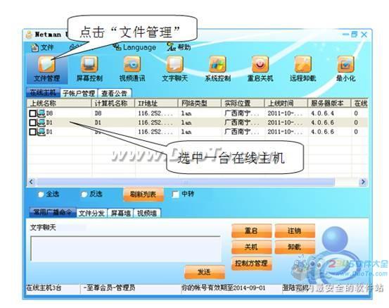 三、網絡人遠程控制軟件設置好文件共享后,選中遠程電腦,通過“文件管理”進入文件管理界面,可通過復制、粘貼、剪切或直接拖拽等操作管理本地磁盤和遠程磁盤或文件夾。