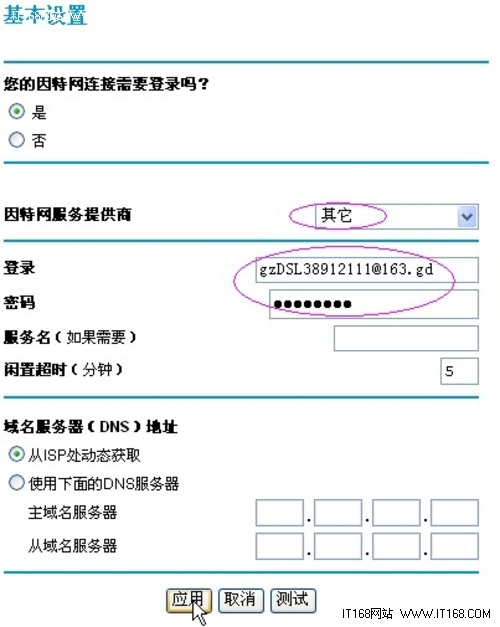 4.1.1. 第一個(gè)選擇項(xiàng)”您的因特網(wǎng)連接需要登錄嗎?”,選擇“是”,”因特網(wǎng)服務(wù)提供商”選擇“其它”,在”登錄”和”密碼”后面的空白欄中分別鍵入寬帶帳號和密碼,然后點(diǎn)擊“應(yīng)用”,如圖: