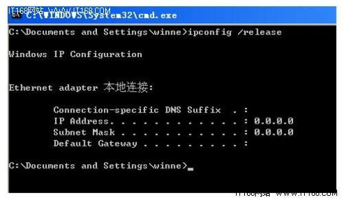 b)輸入清除IP地址的命令ipconfig/release,等待片刻后IP地址被釋放,如下: