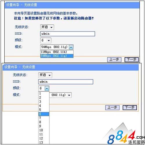 接著模式這一選項拉下來我們可以看到TP-LINK無線路由的幾個基本無線連接工作模式,11Mbps(802.11b)最大工作速率為11Mbps;54Mbps(802.11g)最大工作速率為54Mbps,也向下兼容11Mbps。(在TP-LINK無線路由產品里還有一些速展系列獨有的108Mbps工作模式)。