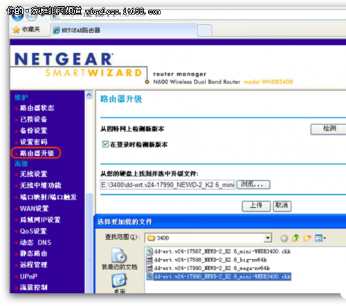 我們升級一個(gè)名為:dd-wrt.v24-17990_NEWD-2_K2.6_mini-WNDR3400.chk的文件。
