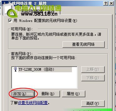 首先,打開無線網絡屬性,然后點擊“添加”按鈕,如下圖: