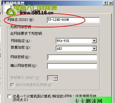 然后,在彈出窗口里填上無線網絡的SSID,如果網絡已經加密,則一般是使用WPA-PSK網絡驗證,數據加密是AES,然后填上網絡密鑰,點擊“確定”保存,即可。