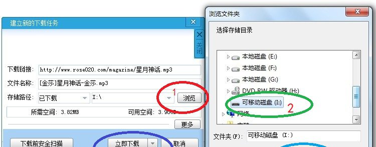 5、點了下載鏈接會彈出迅雷的下載保存框框,設置好保存在哪里,如下圖,(一般手機,MP3,MP4,插在電腦上標示都是“可移動磁盤”。)按圖上的步驟,1、點“瀏覽”彈出文件保存選擇框,2、選擇保存在你手機或MP3,MP4的移動磁盤,3、設置好后點確定,4設置好后點立即下載。等下載完,歌曲就保存到你的手機或是MP3,MP4里了,按這個操作接著下載其他的歌曲吧。