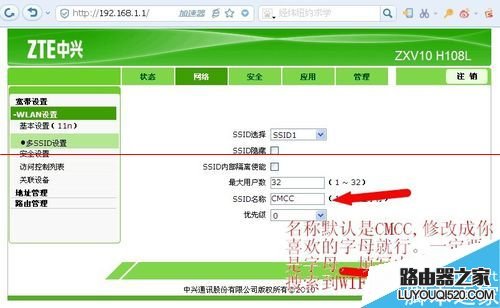 7、網絡--WLAN設置--多SSID設置,默認名稱是CMCC,你可以修改成你喜歡的wifi名稱。比如:520WIFI。名稱一定要是字母或數字,不能用中文哦,中文的WIFI名稱會顯示亂碼。點擊確定。