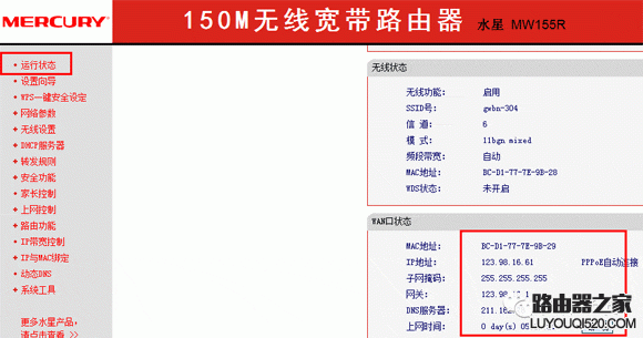7、路由器會(huì)自動(dòng)重啟,重啟完成后進(jìn)入登錄界面(192.168.1.1),打開(kāi)運(yùn)行狀態(tài),等待1-2分鐘,正常情況下此時(shí)看到WAN口狀態(tài)——IP地址欄有具體的參數(shù)而不是0.0.0.0,說(shuō)明此時(shí)路由器已經(jīng)連通互聯(lián)網(wǎng)了,如果WAN口已獲取到IP地址,便可以嘗試打開(kāi)瀏覽器瀏覽網(wǎng)頁(yè)、登陸QQ了。