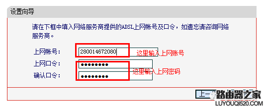 4、這里需要輸入您的上網(wǎng)賬號(hào)和密碼,請(qǐng)找出您的上網(wǎng)賬號(hào)卡,刮開(kāi)密碼涂層輸入密碼(如果您有修改新的密碼,請(qǐng)輸入新的密碼,輸入完成后,點(diǎn)擊下一步,如下圖;