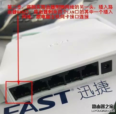 2、將網(wǎng)線的另一頭插入路由器的WAN口,路由器剩余4個(gè)LAN口中的一個(gè)插入網(wǎng)線和電腦網(wǎng)卡接口相連