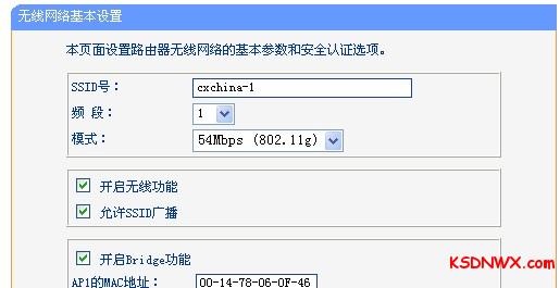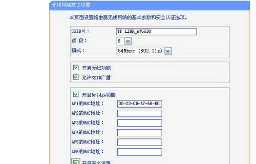 在左側無線參數“基本設置”這一欄,我們可以看到圖上所示列表。進行無線橋接,SSID號最好相同,因為這樣可以實現無線漫游。頻段也必需相同,一般情況下都會默認6,但是家中有微波爐的話,建議更改成1或者11。