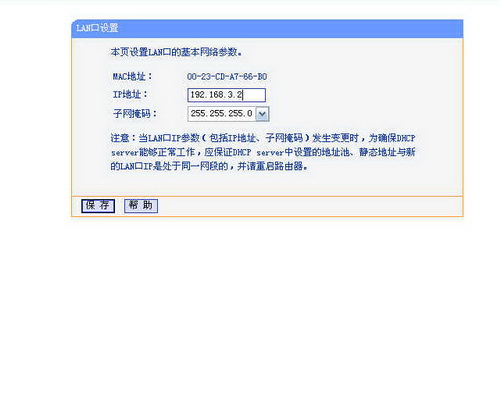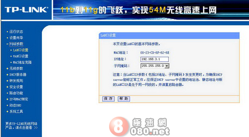 進入在網絡參數這一欄可以看到這款路由的具體MAC地址,一般默認情況下,TP-Link的路由都會默認IP是192.168.1.1,子掩碼是:255.255.255.0。建議大家將其IP地址進行更改,以免與其它設備沖突,如圖所示,我們更改為192.168.3.1。