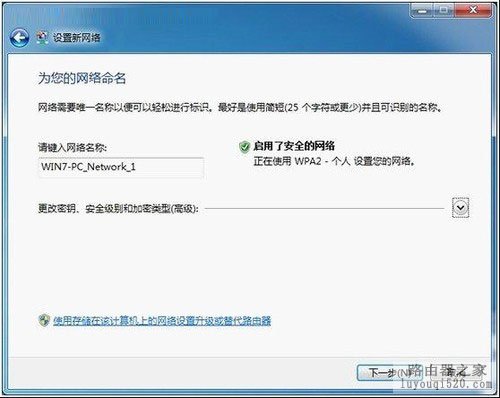 6、操作完后,然后系統會自動賦予一個網絡名稱,同時,Win7也會默認選擇一個可用的、安全級別最高的加密方式來保護用戶的信息安全。此時如果你不想進行任何高級的設置,可以直接點擊下一步。