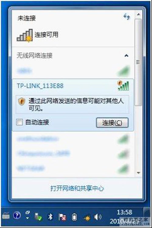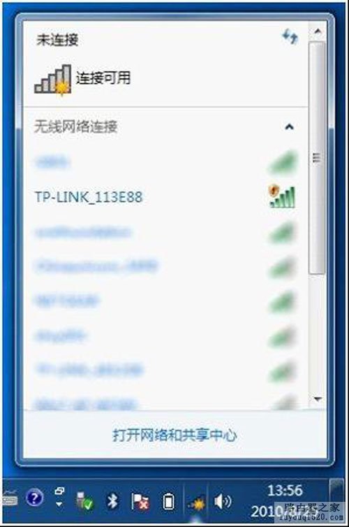 接好路由器,打開電源,在win7下,點擊通知欄中“網絡”圖標,通過無線搜索到路由器。