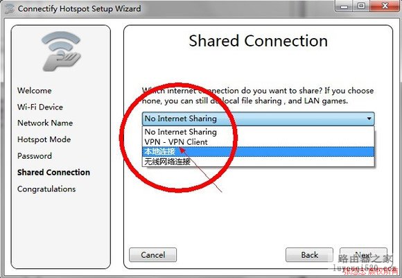 4、選擇需要共享的網絡,一般為 “本地連接”