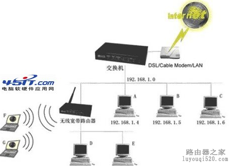 假設某一網絡拓撲結構如下圖所示,該網絡使用DSL/Cable Modem/LAN等方式連接到Internet,由Modem或路由器共享Internet連接,內部網絡則通過交換機連接起來,以實現多臺電腦接入上網。假設交換機已開啟DHCP功能自動分配IP地址,IP段是192.168.1.0,則以太網的電腦A、B、C的IP為192.168.1.x(X為2-255之間任意一數字,下同),并能正常上網。現在,如果在一個節點接上無線寬帶路由器,它下面用網線連接了D、E等臺式電腦,以及用無線方式連接了筆記本電腦F、G。怎樣設置才能保證D,E,F,G同時上網呢?(D,E為有線連接,F,G為無線連接)