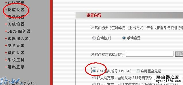 (3)找到【快速設(shè)置】,設(shè)置ADSL。由于不同品牌路由器,設(shè)置界面不同,所以這里僅以IPCom無(wú)線路由器為例,其它品牌路由器的設(shè)置過(guò)程基本類(lèi)似,總之你找到設(shè)置ADSL的地方就可以了。