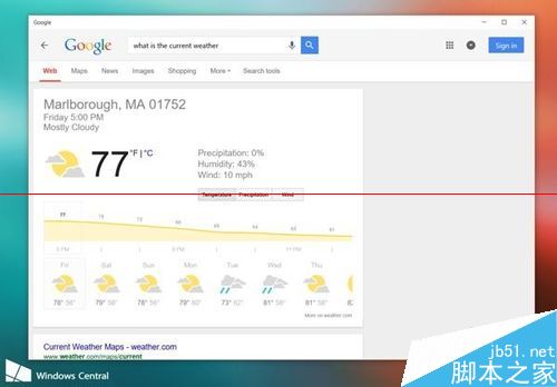 6、此外,Google搜索應用還具有“智能搜索”功能,當我們搜索“天氣”情況時,會自動定位當前地理位置并顯示當前天氣情況。