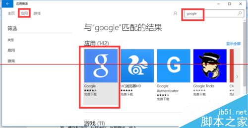 2、待打開“Win10應用商店”界面后,切換到“應用”選項卡,在搜索框中輸入“Google”進行搜索,從搜索結果中選擇如圖所示的應用點擊進入。
