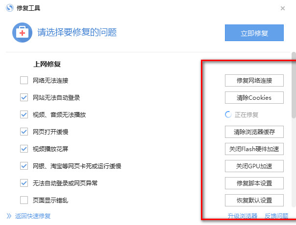 快速修復可修復網站無法登陸、音視頻無法播放、網頁打開緩慢、虛擬內存等問題,如果可以在快速修復界面找到你遇到的問題,則點擊快速修復,
