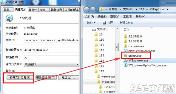 方法三、我們右擊yy瀏覽器圖標==“屬性”==“打開文件位置”==點擊“uninst.exe”;