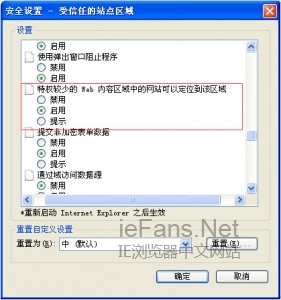 再打開的選項卡里,選擇啟用“特權較少的Web內容區域中的網站可以定位到該區域選項”,就能解決打開網站總彈出的這些警告。
