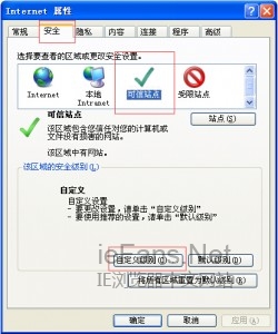 在開始菜單—控制面板里面,打開Internet 選項,然后點擊安全選項卡,選擇可信站點,再選擇自定義級別,如圖: