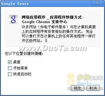 點擊“網頁”菜單,選擇“創建應用程序快捷方式”。在”Google Gears”對話框中,選擇要在放置快捷方式的位置的復選框。