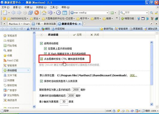 將打開的“傲游設置中心”頁面切換到“浮動按鈕”子頁面,選中其中的“點擊圖像時按住Ctrl鍵快速保存圖像”選項,接著單擊“應用”按鈕,則以后用戶只要在按下Ctrl鍵的同時單擊網頁中需要保存下來的圖片鏈接,傲游瀏覽器即會自動將圖片下載并保存到指定位置。這款軟件可以支持待收藏圖片的批量點擊和批量保存(如圖5)。