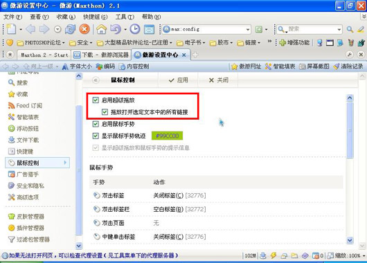 其實在傲游瀏覽器中,用戶借助“鼠標控制”功能,可以快速實現批量鏈接在多個網頁頁面中同時打開。用戶打開“傲游設置中心”頁面中的“鼠標控制”子頁面,接著同時選中“啟用超級拖放”和“拖放打開選定文本中的所有鏈接”兩個選項,最后單擊“應用”按鈕即可(如圖6)。