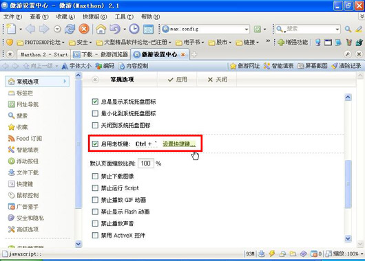 當然對于軟件默認的快捷鍵,用戶還可以通過更改設置來自行定義:同樣打開“傲游設置中心”頁面中的“常規選項”子頁面,在其中的“啟用老板鍵”里即可進行快捷鍵的更改了,更改完畢后,還別忘記在頁面上方單擊“應用”按鈕哦(如圖2)。