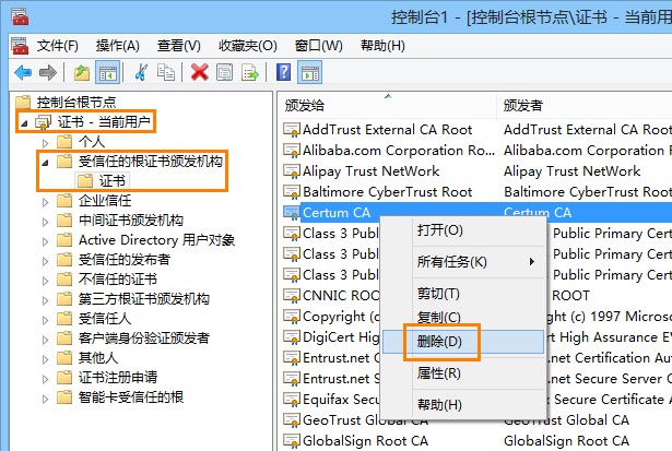 6、展開“證書”=》“受信任的根證書頒發機構”=》“證書” ,在右側列表中查找你需要刪除的證書,然后在將其刪除;