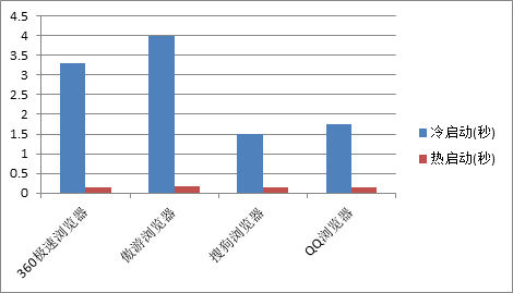冷啟動的測試結果可分為兩組,360極速瀏覽器和傲游瀏覽器為一組,搜狗瀏覽器和QQ瀏覽器為二組。一組的啟動速度約為二組的兩倍。究其原因,是搜狗瀏覽器和QQ瀏覽器均使用了預讀技術, 大大加快了冷啟動的速度。對于經常需要在不同場所奔波做演示的商務用戶來說,更快的啟動速度意味著能留給客戶更好的印象。而熱啟動的速度則相差不大。