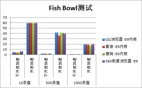 從測試結果可以看出,硬件GPU加速的效果非常明顯,能夠大幅提高測試的成績。而不同瀏覽器的優化也不經相同,依然是360極速瀏覽器和QQ瀏覽器的成績分居一二位。