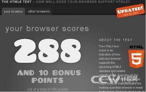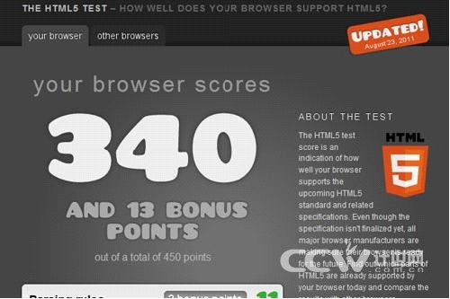 其測試焦點集中在ECMAScript、DOM Level 3、Media Queries和data: URL。瀏覽器開啟此測試網(wǎng)頁后,頁面會不斷加載功能、直接給予分?jǐn)?shù),滿分為100分。