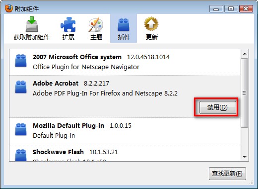 禁用插件的方法:點擊“工具-附加組件”菜單,選擇“插件”面板,選中要禁用的插件、點擊“禁用”,重啟瀏覽器后即可生效。