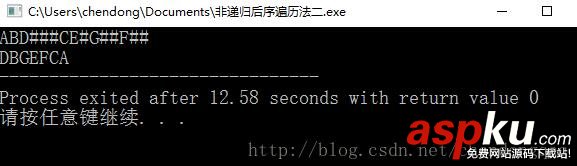 法二:實現思路。按先序遍歷訪問每一個結點。存入棧中,當為空時,就出立即棧(第一次出棧)。出棧后應該立即進棧,去訪問進棧結點的右結點,這樣可以保證先輸出左、右結點,再輸出根結點。二次進棧利用flag標記。