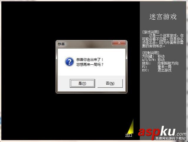 //創建迷宮void CreateMaze(int x,int y){//定義4個方向int dir[4][2] = { 0, 1, 1, 0, 0, -1, -1, 0 }; //回答錯誤//打亂方向int j,temp; //temp 臨時變量for (int i = 0; i < 4; i++){j = rand() % 4; //0-3 數組的下標 //j隨機之后 j同一次還會不會變temp = dir[i][0];dir[i][0] = dir[j][0];dir[j][0] = temp;temp = dir[i][1];dir[i][1] = dir[j][1];dir[j][1] = temp;}map[x][y] = ROAD; //把這個點賦值成路for (int i = 0; i < 4; i++){if (map[x + 2 * dir[i][0]][y + 2 * dir[i][1]] == WALL) //向上 0 1 //隔壁的一個{map[x + dir[i][0]][y + dir[i][1]] = ROAD;CreateMaze(x + 2*dir[i][0], y + 2*dir[i][1]);}}}int main(){srand((unsigned int)time(NULL));for ( int i = 0; i <= HEIGHT+1; i++){for (int j = 0; j <= WIDTH + 1; j++){if (i == 0 || i == HEIGHT + 1 || j == 0 || j == WIDTH + 1){map[i][j] = ROAD;}else{map[i][j] = WALL;}}}CreateMaze(2 * (rand() % (HEIGHT / 2) + 1), 2 * (rand() % (WIDTH / 2) + 1));//邊界for (int i = 0; i <= HEIGHT + 1; i++){map[i][0] = WALL;map[i][WIDTH + 1] = WALL;}for (int i = 0; i <=WIDTH+1; i++){map[0][i] = WALL;map[HEIGHT + 1][i] = WALL;}//畫出入口和出口map[2][1] = START;map[HEIGHT - 1][WIDTH] = END;for (int i = 1; i <= HEIGHT; i++){for (int j = 1; j <= WIDTH; j++){paint(i, j);}}paint(0, 0);return 0;}這只是里面的一部分代碼,所以你們復制粘貼也是沒用的,給你們代碼只是輔導作用,主要是你們要知道編程思想及程序設計的思路,希望你們能學好C/C++學成C/C++咯。