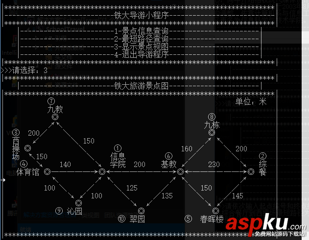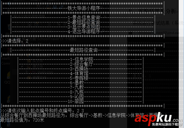#include<iostream>#include<fstream>#include<string>using namespace std;/** *作者:Dmego *時間:2016-12-12 */#define MAX 1000000 //表示極大值∞#define max 10bool S[max]; //記錄從源點V0到終點Vi是否已經確定為最短路徑,確定了記true,否則記falseint Path[max]; //記錄從源點V0到終點Vi的當前最短路徑上終點Vi的直接前驅頂點序號,若V0到Vi之間有邊前驅為V0否則為-1 int D[max]; //記錄源點到終點之間最短路徑的長度,存在記V0到Vi的邊的權值,否則記為MAX typedef struct{ string vexs[max]; //頂點表 int arcs[max][max]; //鄰接矩陣 int vexnum, arcnum; //圖當前點數和邊數}AMGraph;//利用迪杰斯特拉算法求最短路徑void ShortestPath_DIJ(AMGraph &G, int v0){//使用迪杰斯特拉算法求有向網G中的V0 定點到其余頂點的最短路徑 int n = G.vexnum;//頂點數 for (int v = 0; v < n; v++)//n個頂點依次初始化 { S[v] = false;//S初始化為空集 D[v] = G.arcs[v0][v];//將v0到各個終點的最短路徑長度初始化為邊上的權值 if (D[v] < MAX) Path[v] = v0;//如果v0和v之間有邊,則將v的前驅初始化為v0 else Path[v] = -1;//如果v0和v之間無邊,則將v的前驅初始化為-1 } S[v0] = true; //將v0加入s D[v0] = 0;//源點到源點的權值為0 //---------初始化結束,開始主循環,每次求得v0到某個頂點的最短路徑,將v加到S數組 for (int i = 1; i < n; i++)//依次對其余n-1個頂點進行計算 { int min = MAX; int v = v0; for (int w = 0; w < n; w++) { if (!S[w] && D[w] < min) {//選擇一條當前最短路徑,終點為v v = w; min = D[w]; } S[v] = true;//將v加到s集合中 for (int w = 0; w < n; w++) {//更新從v0出發到集合V-S上所有頂點的最短路徑長度 if (!S[w] && (D[v] + G.arcs[v][w] < D[w])) { D[w] = D[v] + G.arcs[v][w];//更新D[w] Path[w] = v;//更改w的前驅為v } } } }}//背景函數void backGround(){ cout << "|*****************************************************************|" << endl; cout << " |------------------------鐵大旅游景點圖-----------------|" << endl; cout << "|*****************************************************************|" << endl; cout << "| ⑦ 單位:米 |" << endl; cout << "| 九教 |" << endl; cout << "| ◎ ⑧ |" << endl; cout << "| ↗↖ 九棟 |" << endl; cout << "| ③ 200╱ ╲ ◎ |" << endl; cout << "| 西 ↙ ╲ 150 ↗ ↖ |" << endl; cout << "| 操 ◎ ╲ ① 160 ╱ ╲ 200 |" << endl; cout << "| 場 ↖150 ╲ 信息 ⑥ ╱ ╲ |" << endl; cout << "| ④ ↘ 140 ↘ 學院 200 基教 ↙ 230 ↘ |" << endl; cout << "| 體育館 ◎-------------→◎←--------------→◎←--------------→◎ |" << endl; cout << "| ↖ ↗ ↖ ↗ ↖ ↗② |" << endl; cout << "| 100 ╲ ╱ ╲ 125 ╱ ╲ 150 ╱ 綜 |" << endl; cout << "| ↘ ↙ 100 ╲ ╱135 ╲ ╱145 餐 |" << endl; cout << "| ◎ ↘ ↙ ↘ ↙ |" << endl; cout << "| ⑨ 沁園 ◎ ◎ |" << endl; cout << "| ⑩ 翠園 ⑤ 春暉樓 |" << endl; cout << "| |" << endl; cout << "|*****************************************************************|" << endl;}//主菜單void menu(){ cout << "|*****************************************************************|" << endl; cout << "|----------------------------鐵大導游小程序-----------------------|" << endl; cout << " |*********************************************************|" << endl; cout << " |--------------------1-景點信息查詢--------------|" << endl; cout << " |--------------------2-最短路徑查詢--------------|" << endl; cout << " |--------------------3-顯示景點視圖--------------|" << endl; cout << " |-------------------4-退出導游程序------ --------|" << endl; cout << "|*****************************************************************|" << endl; cout << ">>>請選擇:";}//景點信息查詢二級菜單void jmenu(){ cout << "|*****************************************************************|" << endl; cout << " |-------------------------景點信息查詢------------------------|" << endl; cout << " |***********************************************************|" << endl; cout << " |----------------------1-信息學院介紹-------------------| " << endl; cout << " |----------------------2-綜合餐廳介紹-------------------| " << endl; cout << " |----------------------3-西操場介紹---------------------| " << endl; cout << " |----------------------4-體育館介紹---------------------| " << endl; cout << " |----------------------5-春暉樓介紹---------------------| " << endl; cout << " |----------------------6-基教介紹-----------------------| " << endl; cout << " |----------------------7-九教介紹-----------------------| " << endl; cout << " |----------------------8-九棟介紹-----------------------| " << endl; cout << " |----------------------9-沁園介紹-----------------------| " << endl; cout << " |---------------------10-翠園介紹-----------------------| " << endl; cout << "|*****************************************************************|" << endl; cout << ">>>請要查詢的景點編號:";}//最短路徑查詢二級菜單void pmenu(){ cout << "|*****************************************************************|" << endl; cout << " |-------------------------最短路徑查詢------------------------|" << endl; cout << " |***********************************************************|" << endl; cout << " |---------------------1-信息學院-------------------| " << endl; cout << " | --------------------2-綜合餐廳-------------------| " << endl; cout << " |---------------------3-西操場---------------------| " << endl; cout << " |---------------------4-體育館---------------------| " << endl; cout << " |---------------------5-春暉樓---------------------| " << endl; cout << " |---------------------6-基教-----------------------| " << endl; cout << " |---------------------7-九教-----------------------| " << endl; cout << " |---------------------8-九棟-----------------------| " << endl; cout << " 