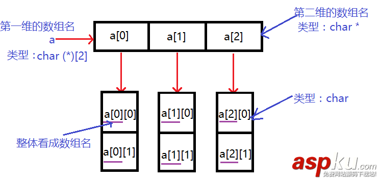 char (*p)[2] = a;//a為第一維數組的數組名,類型為char (*)[2] char * p = a[0];//a[0]維第二維數組的數組名,類型為char *