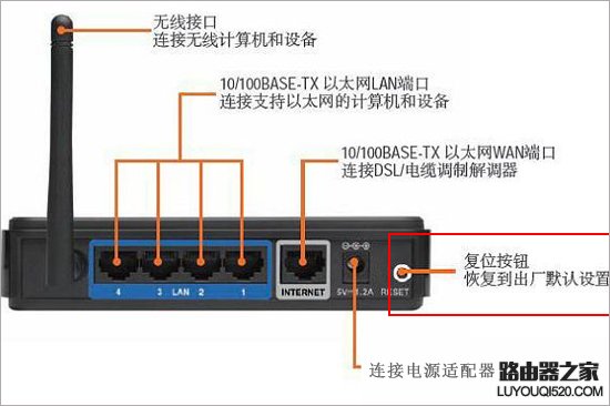 恢復出廠設置的方法:在路由器背后,有一個Reset鍵(有的是凸出來的小按鈕,有的事凹進去的按鈕,凹進去的按鈕需要用牙簽或回形針捅),路由器通電的情況下,按住10秒鐘的時間(一般路由器上的所有燈會一起亮為Ok的標準)后,路由器就恢復到了出廠設置了,跟你買回來的狀態一樣,具體操作如下圖所示: