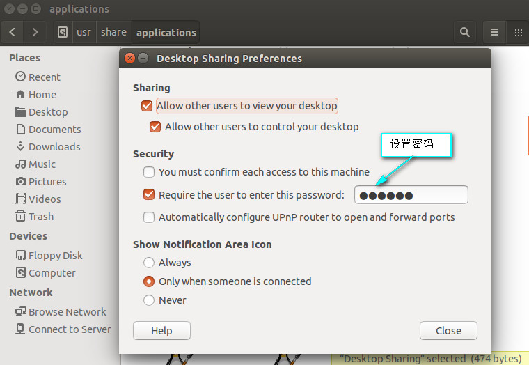 安裝完后在/usr/share/applications目錄下打開”Desktop Sharing(桌面共享)”選項,進一步設(shè)定桌面共享選項中首先要開啟共享,關(guān)于是否允許其他用戶控制,遠程連接時是否需要本機確認,遠程連接的密碼等項目根據(jù)需要自己設(shè)定。如果需要從公網(wǎng)即外部網(wǎng)絡(luò)訪問此Ubuntu計算機需要開啟”自動配置UPnP路由器開放和轉(zhuǎn)發(fā)端口項目”。一般建議如下圖: